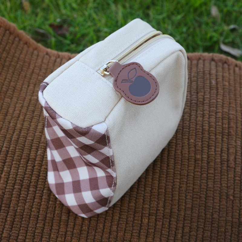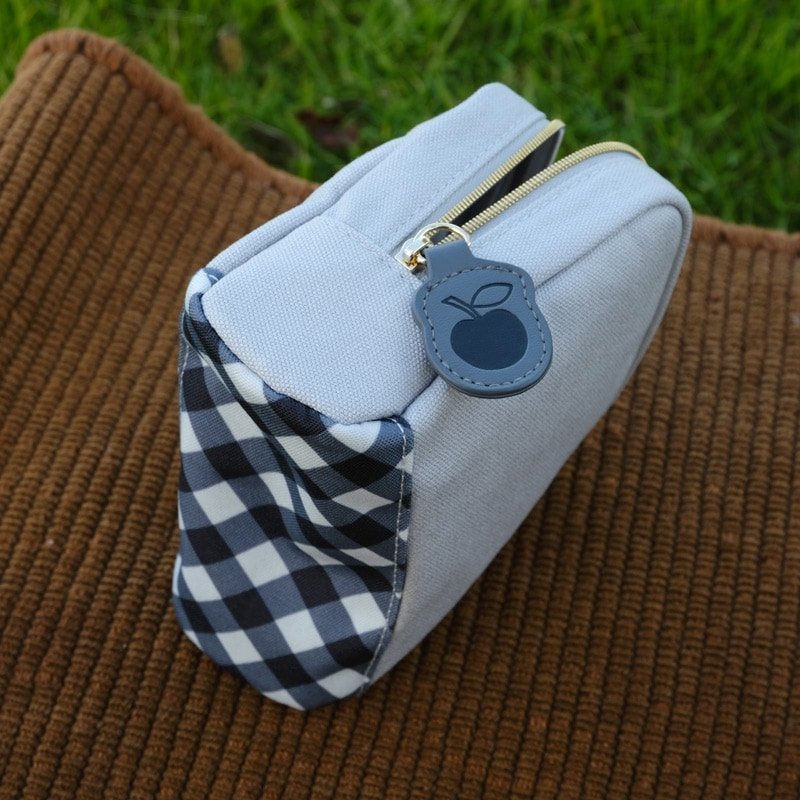 Marimo Craft 以精緻刺繡搭配斜格紋的組合,創作出帶點可愛又成熟的化妝收納包