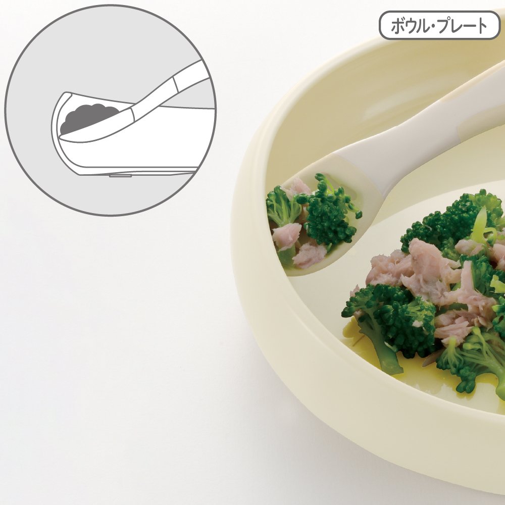 從離乳初期開始就能長期使用,套裝內含獨特設計的碗盤,幫助寶寶輕鬆學習舀食不易灑出。