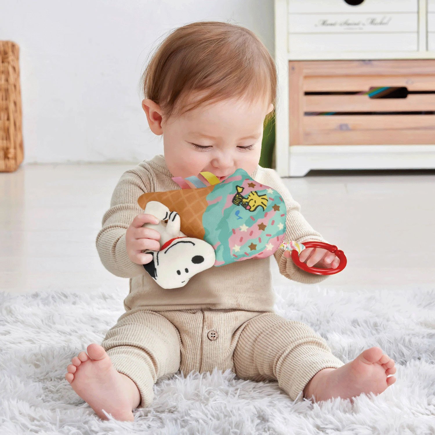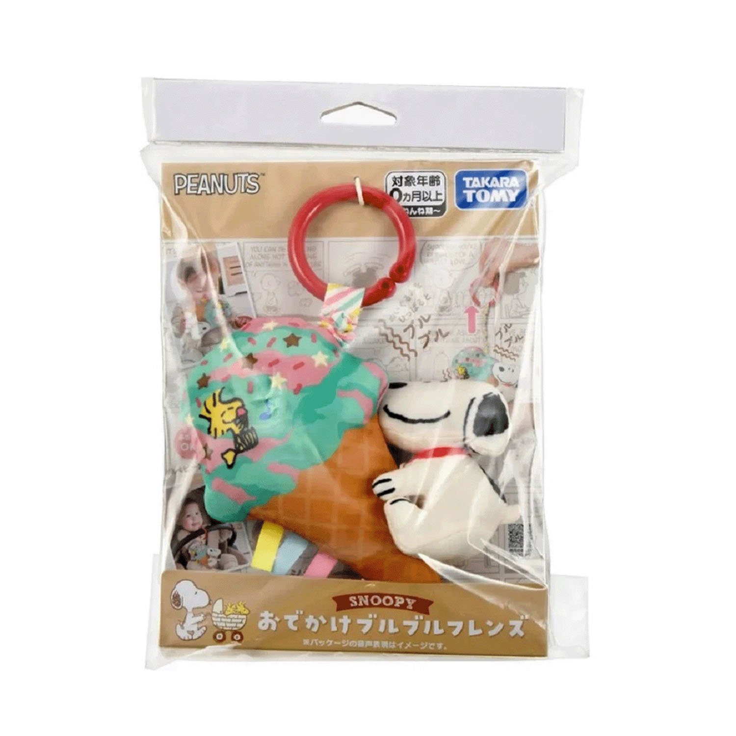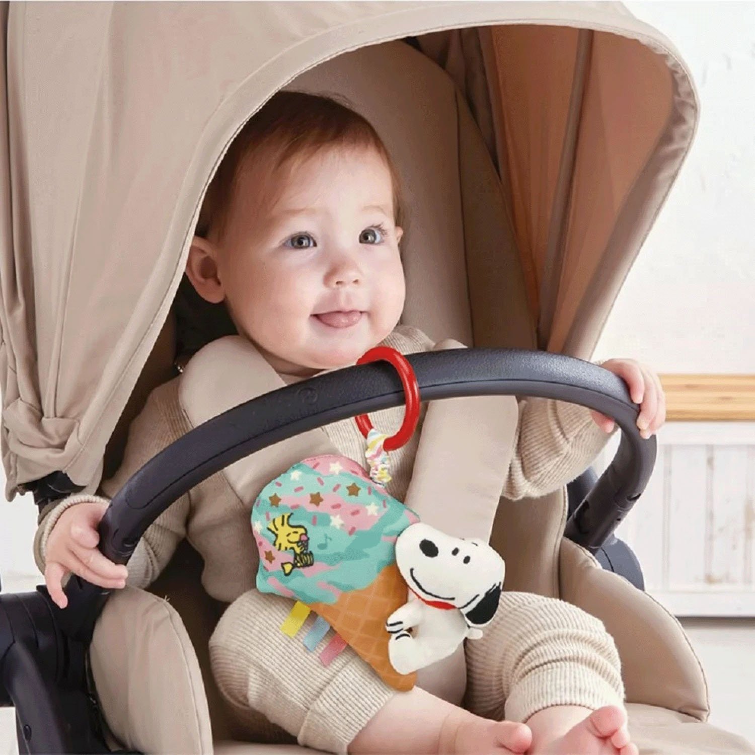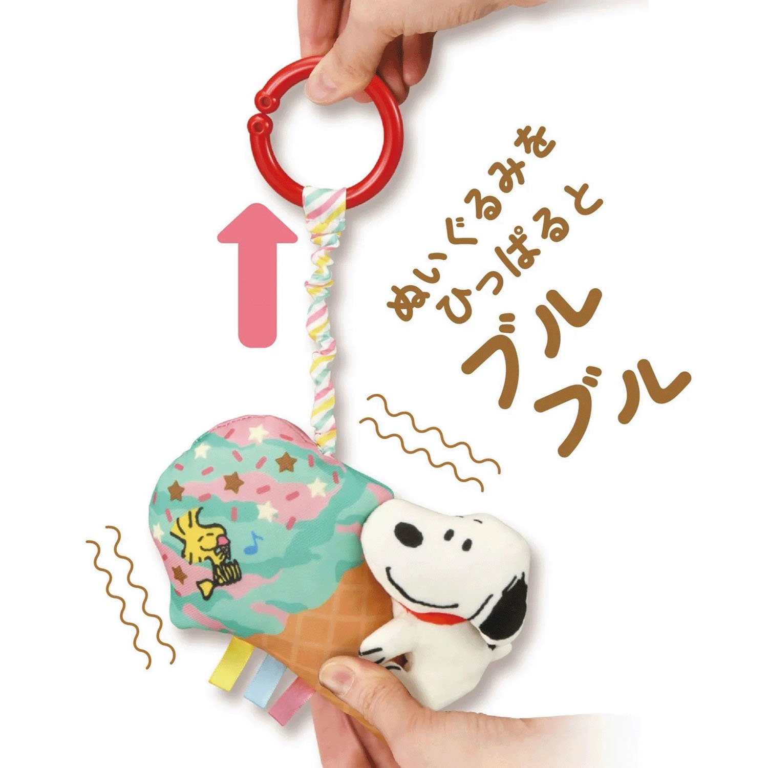 TAKARA TOMY 吊飾玩具可固定在推車護把上,當輕往下拉史努比回收時,會邊抖邊發出聲響・透過聲音與寶寶想觸摸的感受,進而激發寶寶的好奇心