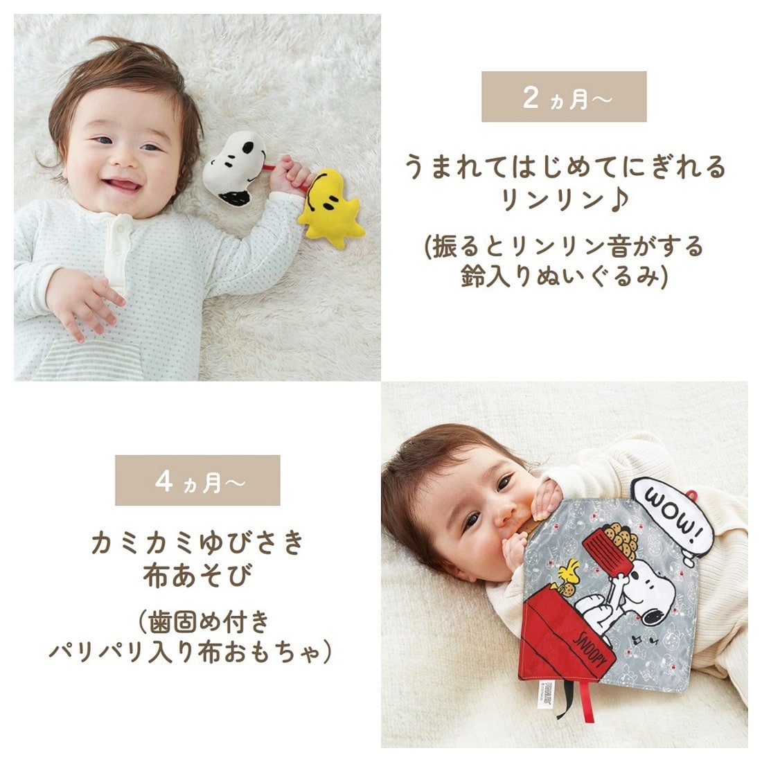 這款禮盒是送給新生兒彌月禮或週歲禮的最佳選擇!專為寶寶設計的史努比嬰兒玩具4件組,從0個月開始即可使用,能溫和地刺激寶寶的視覺、聽覺、觸覺等多重感官發展。